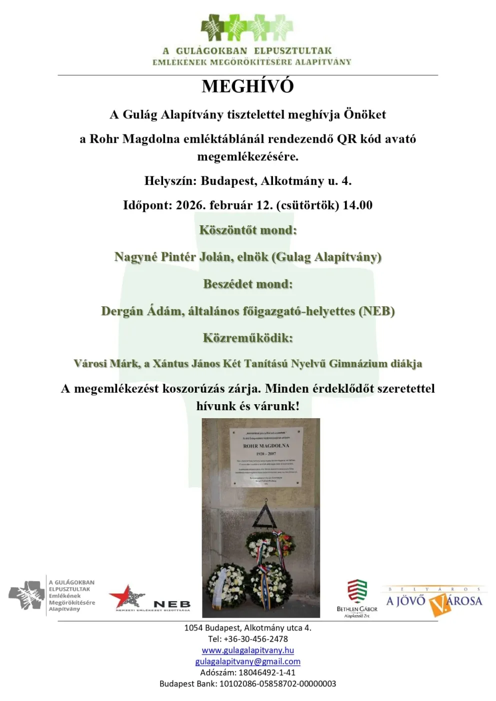 Meghívó - Rohr Magdolna emléktáblánál rendezendő QR kód avató megemlékezésére
